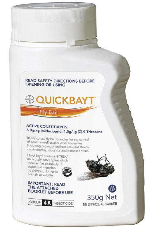 QuickBayt® Fly Bait is a ready-to-use, sugar-based fly granule containing the fast-acting neonicotinoid insecticide, imidacloprid. Imidacloprid is an insect neurotoxin that effectively kills the adult house fly (Musca domestica) and the lesser housefly (Fannia canicularis), including organophosphate resistant strains.
