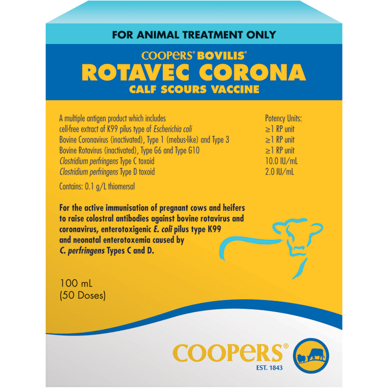 2mL subcutaneous injection. Initial vaccination: first dose 10-12 weeks before expected calving, second dose 4-6 weeks later. Annual booster 4-6 weeks pre-calving
