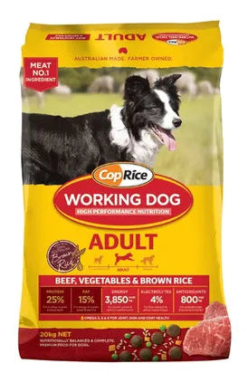 CopRice Working Dog Adult Beef contains Australian meat as the number 1 ingredient, plus added glucosamine, yucca, antioxidants and a bespoke blend of vitamins and minerals.