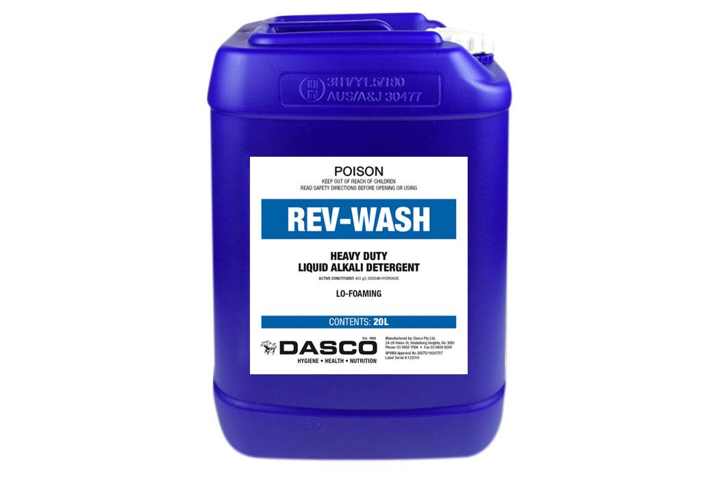 Rev-Wash is a low-foam heavy duty liquid alkaline detergent ideally suited for automatic washing systems or reverse flow plants. It can be used with the hardest of water without changing the amounts used.